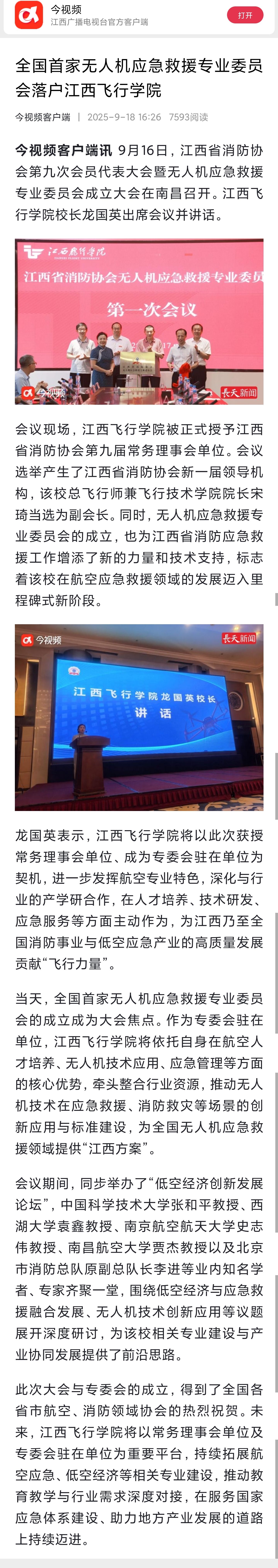 近日,今视频报道,全国首家无人机应急救援专业委员会落户江西飞行学院详情如下: