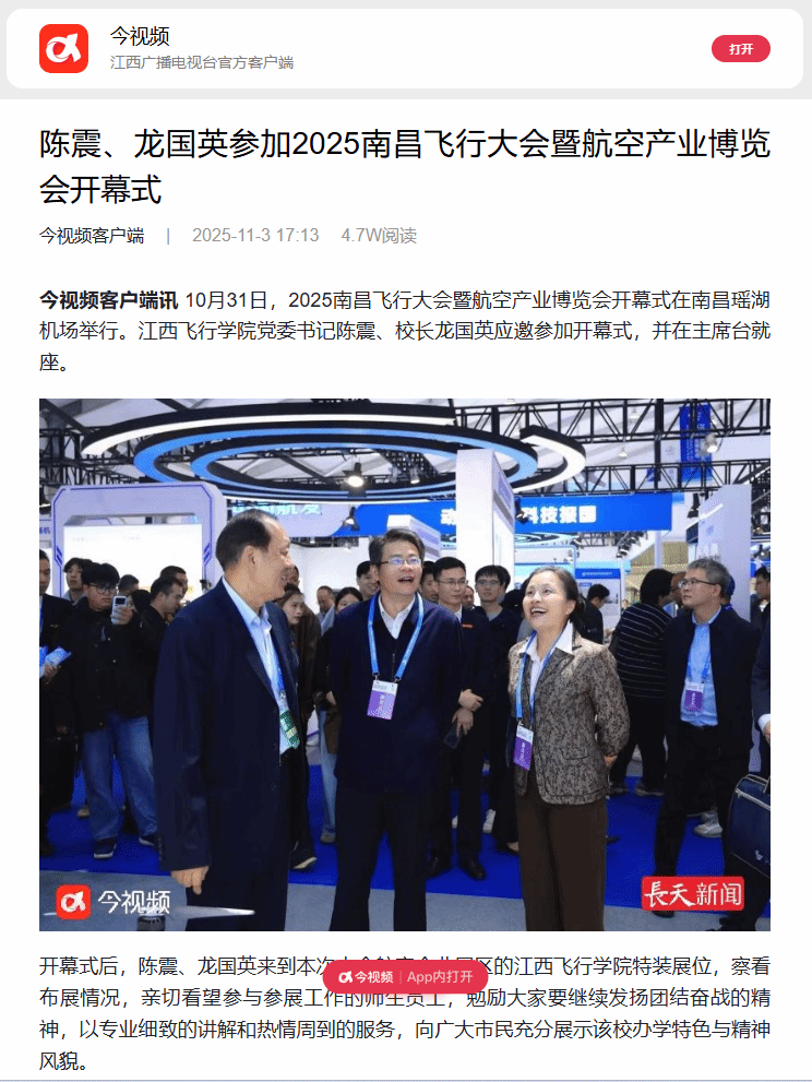 近日,今视频报道,陈震、龙国英参加2025南昌飞行大会暨航空产业博览会开幕式详情如下: