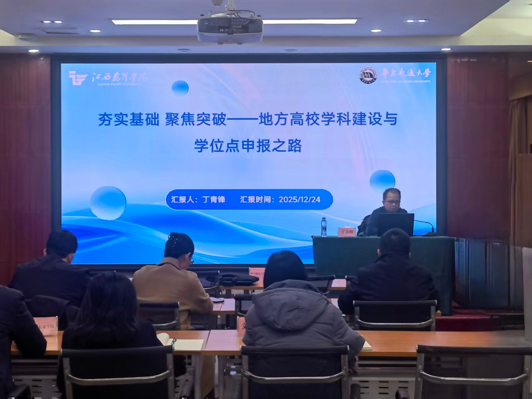 2025年12月24日,我校邀请华东交通大学研究生院(学科建设与评估管理中心)副院长丁青锋博士、教授、博士生导师为学校开展以《夯实基础 聚焦突破—地方高校学科建设与学位点申报之路》为题的学科建设专题讲座。相关职能部门负责人、各二级学院院长、副院长及学科带头人参加了专题讲座,讲座由发展规划处副处长肖学农主持。
