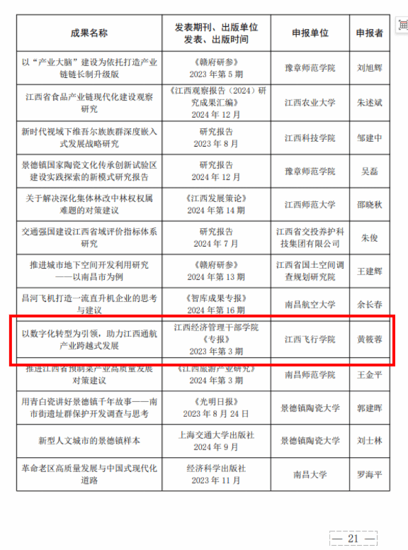 近日,江西省第二十一次社会科学优秀成果奖获奖名单正式公布。江西飞行学院文法学院黄筱蓉教授申报的成果《以数字化转型为引领,助力江西通航产业跨越式发展》荣获优秀成果奖二等奖。