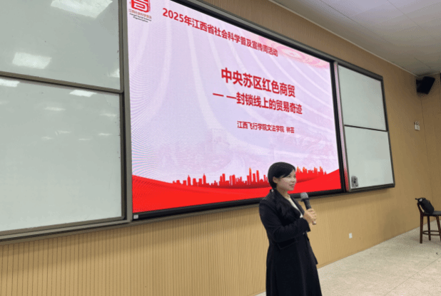 为落实2025年江西省社会科学普及宣传周部署,10月27日,《中央苏区红色商贸——封锁线上的贸易奇迹》专题讲座在江西飞行学院科技楼第三阶梯教室顺利举办。讲座由文法学院院长、江西省赣商文化研究基地主任林芸教授主讲,吸引200余名师生到场聆听。